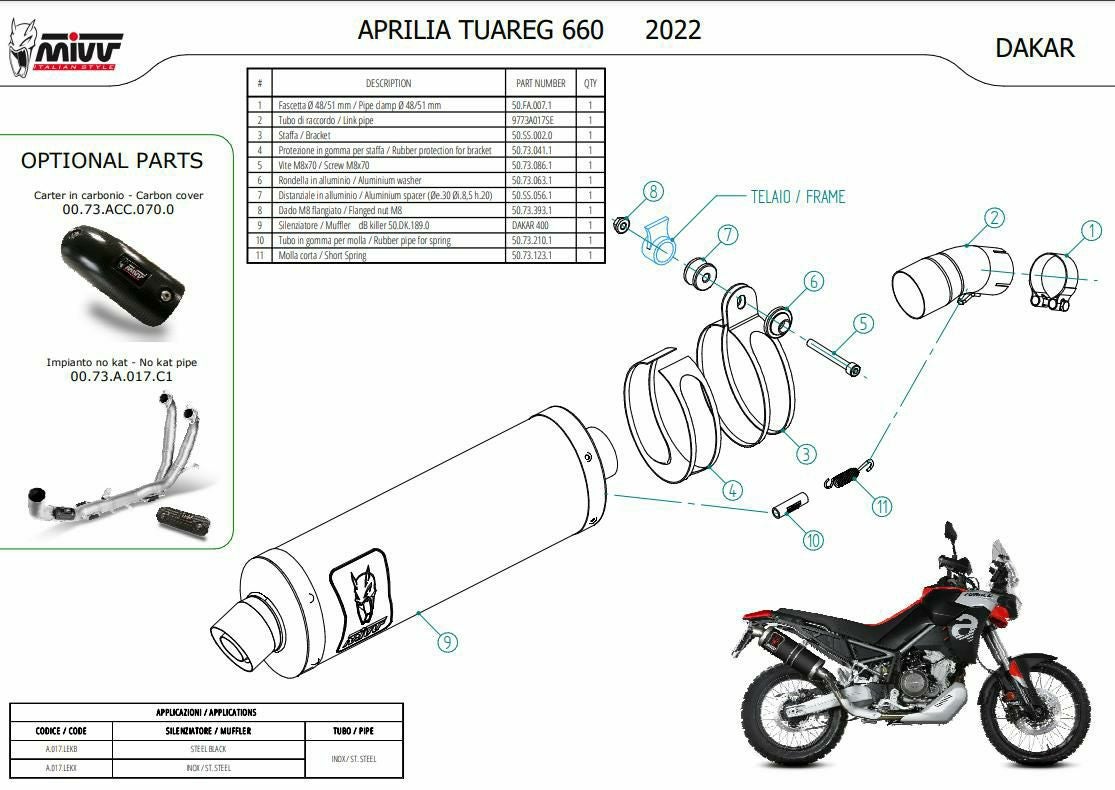 カートに入れる お気に入りに登録する 他の画像を見る MIVV スリップオンマフラー DAKAR ステンレス APRILIA トゥアレグ660 (2022-2024) 商品番号 A.017.LEKX 販売価格 ¥ 85,030 税込 SALE価格 ¥ 85,030 税込 APRILIA トゥアレグ660 (2022-2024)EURO規制対応、車検対応マフラー 4-8週間