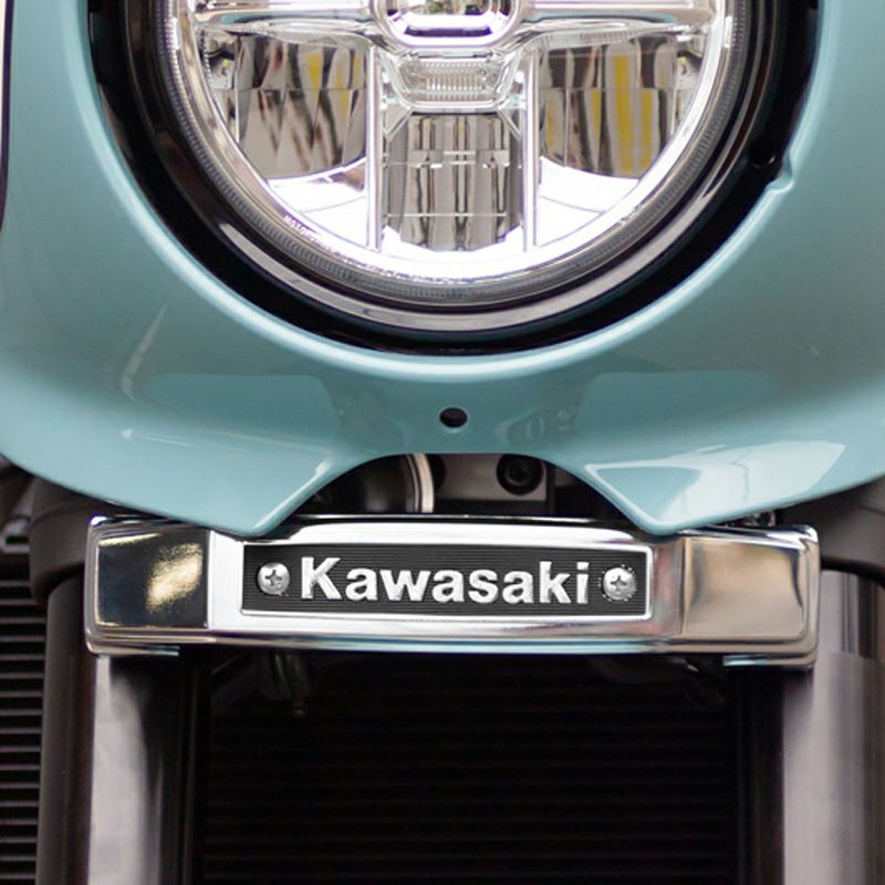 カワサキ Z900RSCAFEのフロントフォークステムに装着する、Kawasakiロゴのエンブレムとマウントステーのセットです。