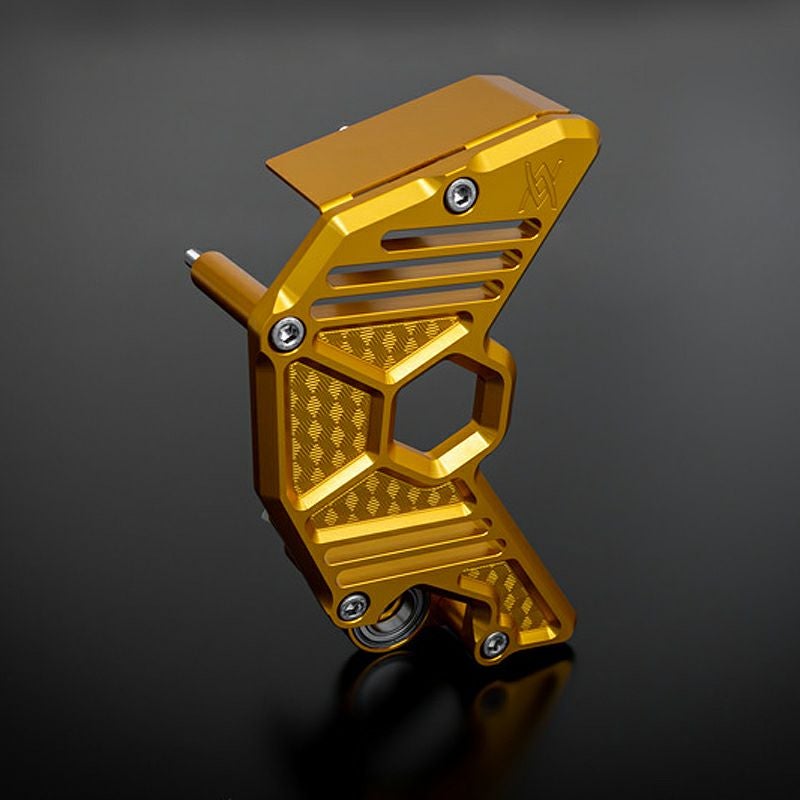 厚さ10mmのアルミニウム製。ビレット材からの削り出し加工品で、大胆な肉抜き加工とコンパクトデザインで、スプロケットやドライブチェーンを覗き見ることが出来、エンジンのメカニカルな美しさを一層引き立てます。