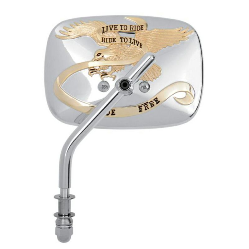 【商品説明】 LIVE TO RIDE RIDE TO LIVE の文字とアメリカンイーグルが浮き彫りされた、ゴージャスなミラー。 アメリカンクルーザーにベストマッチします。 ハウジングはアルミダイキャスト製。 クロームのベースに浮き彫り部分はゴールドのゴージャスな組み合わせ。 貫通式のミラーマウントに挿し込んで付属のコーンナットで締めこんで装着します。 元々ハーレー用のミラーです。 装着には別売の1インチハンドル用ミラーアダプター(DS-302020、0641-0109)が必要です。 右用 単品販売