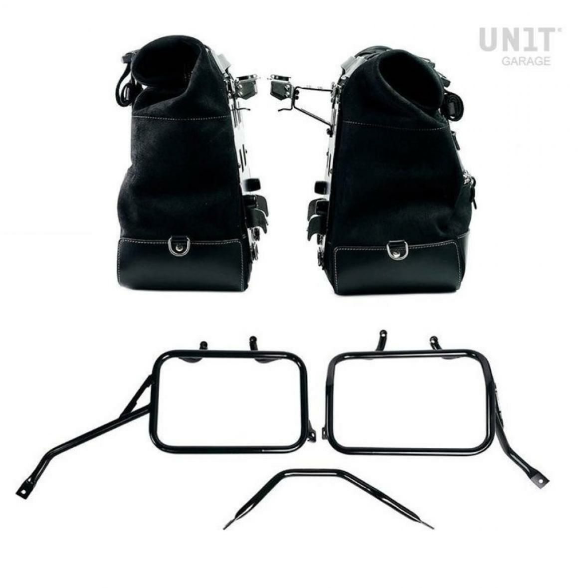トライアンフ スピード400/スクランブラー400X 用、ワックススエード地のカルトサイドパニアバッグジェットブラック+ステンレス製クイックリリースシステム&ロック付きアルミバックプレー+アトラスアルミニウムパニア用ブラックカラーサイドフレームの左右セット