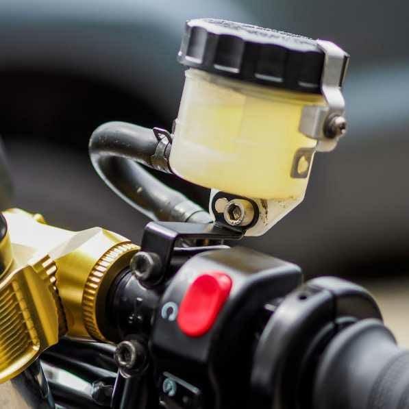 本商品は、リザーバータンクをハンドル周りのクランプ(レバー/マスター周辺のフィッティング)へスマートに移設できる専用ホルダー。