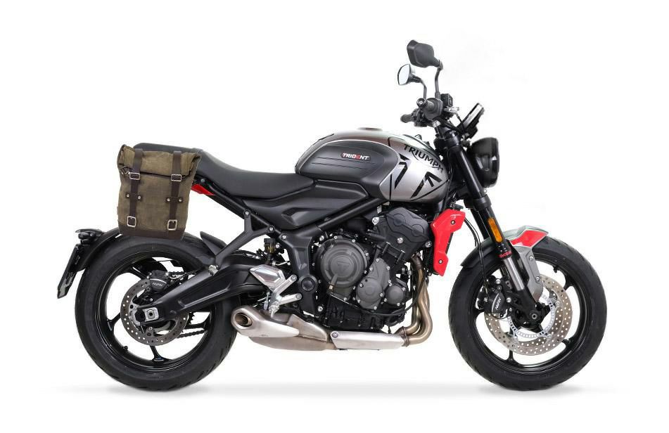 トライアンフ トライデント660専用、UNIT GARAGEのワックス防水加工スエードレザー製サイドバッグと右側サポートフレームのセットです。