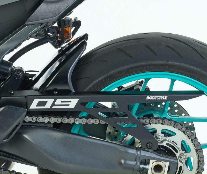 BODYSTYLE Sportsline リアハガー(アルミチェーンガード付)は、YAMAHA MT-09のリアホイール周りをレーシーに引き締めつつ、実用性も高めるスタイリングパーツです。