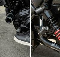 空冷T100へは既存バーエンドの上から付属のアダプターを挟み、既に付けていたMotoneのバーエンドキャップを付け、M5×50のボルトで縫う形で取付しました。