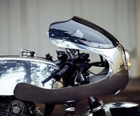 納期4~6週とのことでしたが、届くまで約2ヵ月要しました。コロナ禍中なので致し方ないものと理解してます。 しかし待った甲斐がありました。めっちゃカッコいい! 私のSRカフェ、別物になりました。ドゥカティのイモラカウルのオマージュですが、アルミ製でクロームと見間違いそうなほどのバフ仕上げ。美しい!アルミタンクの再バフポリッシュしなけりゃなりません(笑) 海外製の手作り製品なので個体差があるのでしょうが、私のは完璧な左右対称とはいえないもので、押したり引いたり引っ張ったりひねったり、力技でどうにか妥協できる範囲となりました。 取付の際、配線加工やセパハンの位置とか高さ、角度調整必須です。その場合垂れ角変更可能なハンドルにしないといけないかと。 取付ステーもステンレス製で良くできてますが付属のヘッドライトがすごくチープな製品なんでそれだけが残念な点ですね。欲を言えばシールドはクリアでもう少し高さが欲しかった。 しかしこれだけの製品を作って市販されているオメガレーサーさんと輸入元のモトパーツさんにはリスペクトしかないです。ありがとうございました。 私のバイクライフがさらに充実すること間違いなしです。
